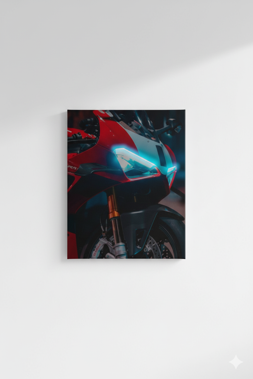 Dinamismo, diseño y poder se combinan en este lienzo decorativo de una motocicleta deportiva roja, una obra que refleja la pasión por la velocidad y la perfección del diseño moderno. Su característico tono rojo intenso y las líneas futuristas evocan adrenalina, libertad y estilo.