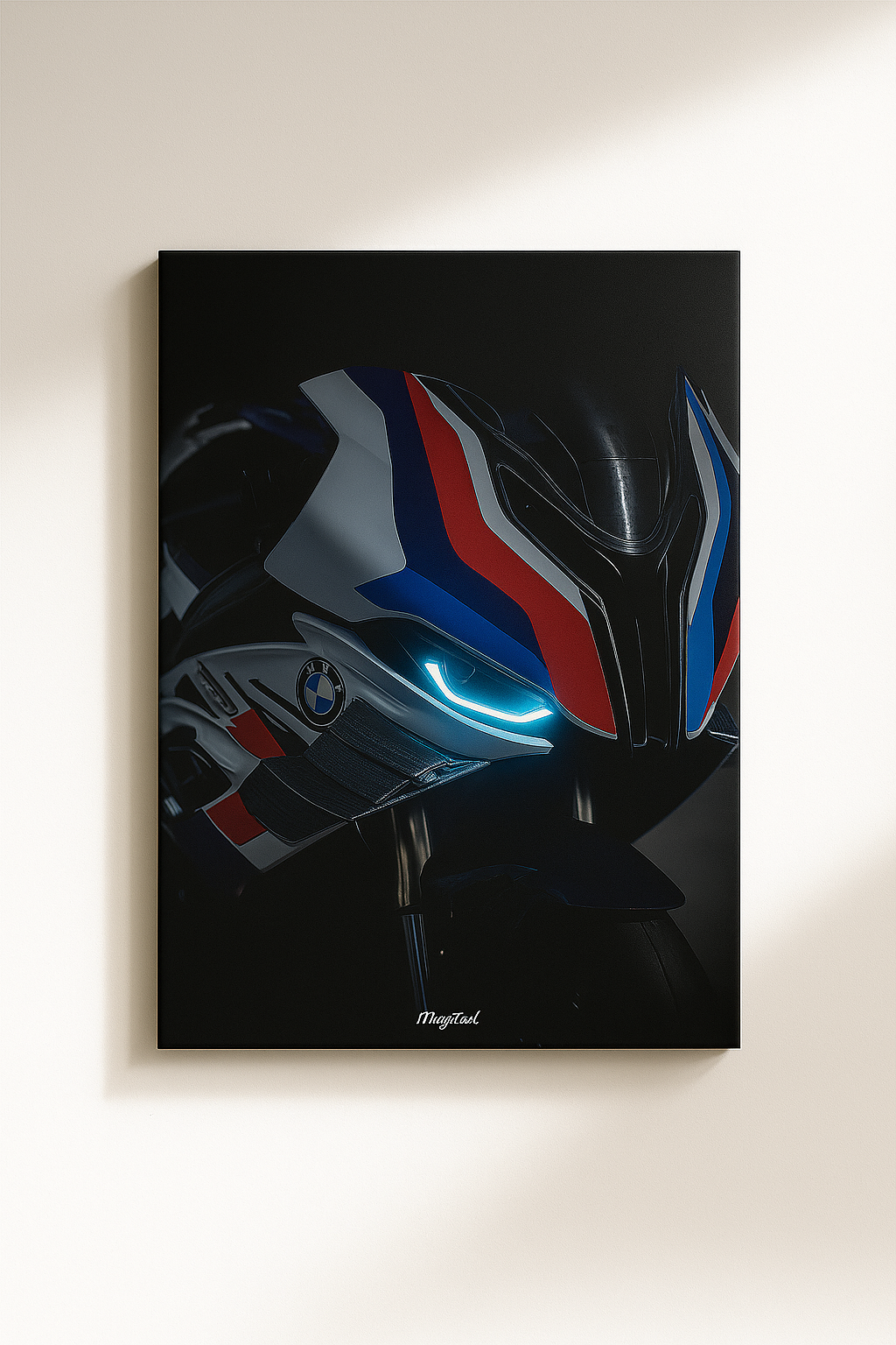 Dale carácter y distinción a tu espacio con este impresionante lienzo decorativo que captura la esencia de la potencia y la precisión alemana. La motocicleta BMW M Sport, con su inconfundible combinación de colores azul, rojo y blanco, representa el equilibrio perfecto entre tecnología, velocidad y elegancia.